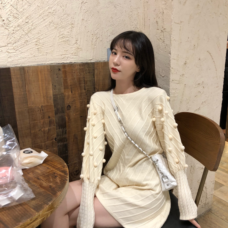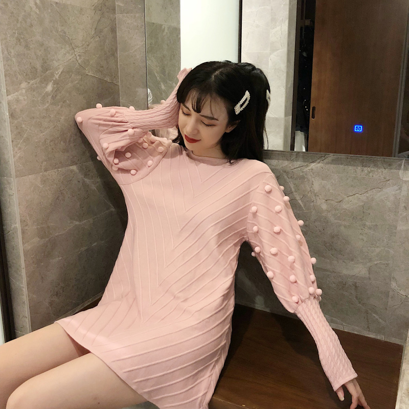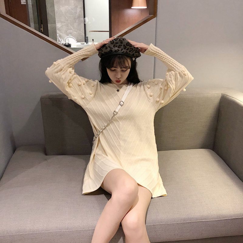 韓版2018秋冬新款寬松重工立體毛球泡泡袖中長款慵懶套頭針織衫女