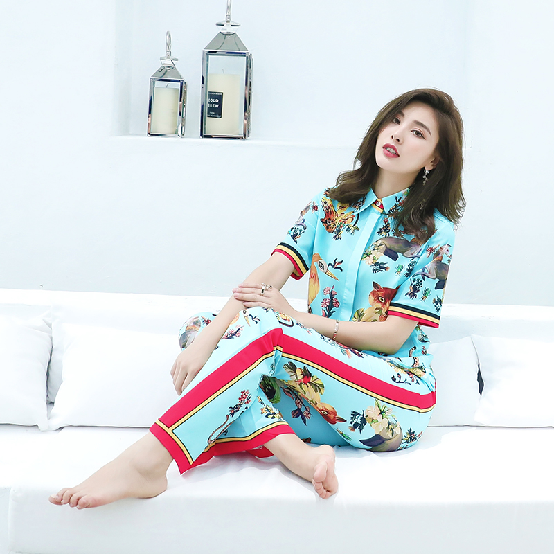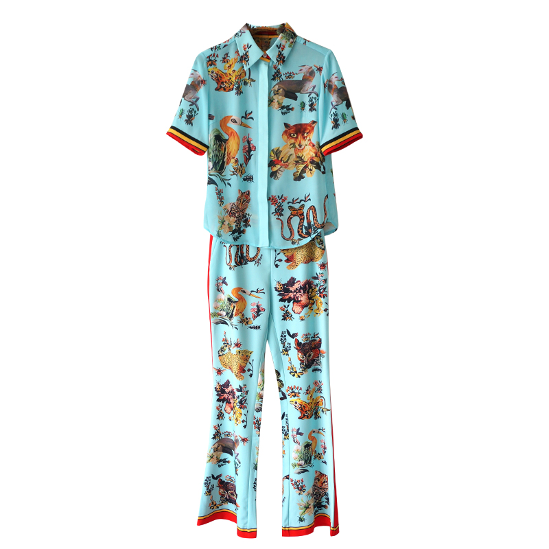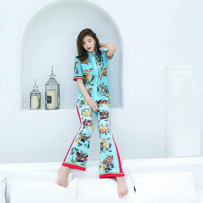 / 名媛氣質2018夏季新款印花短袖襯衫長褲喇叭褲收腰顯瘦套裝兩件套