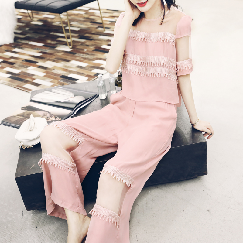 s秀名媛氣質2018夏季新品網紗拼接短袖上衣九分闊腿褲套裝兩件套