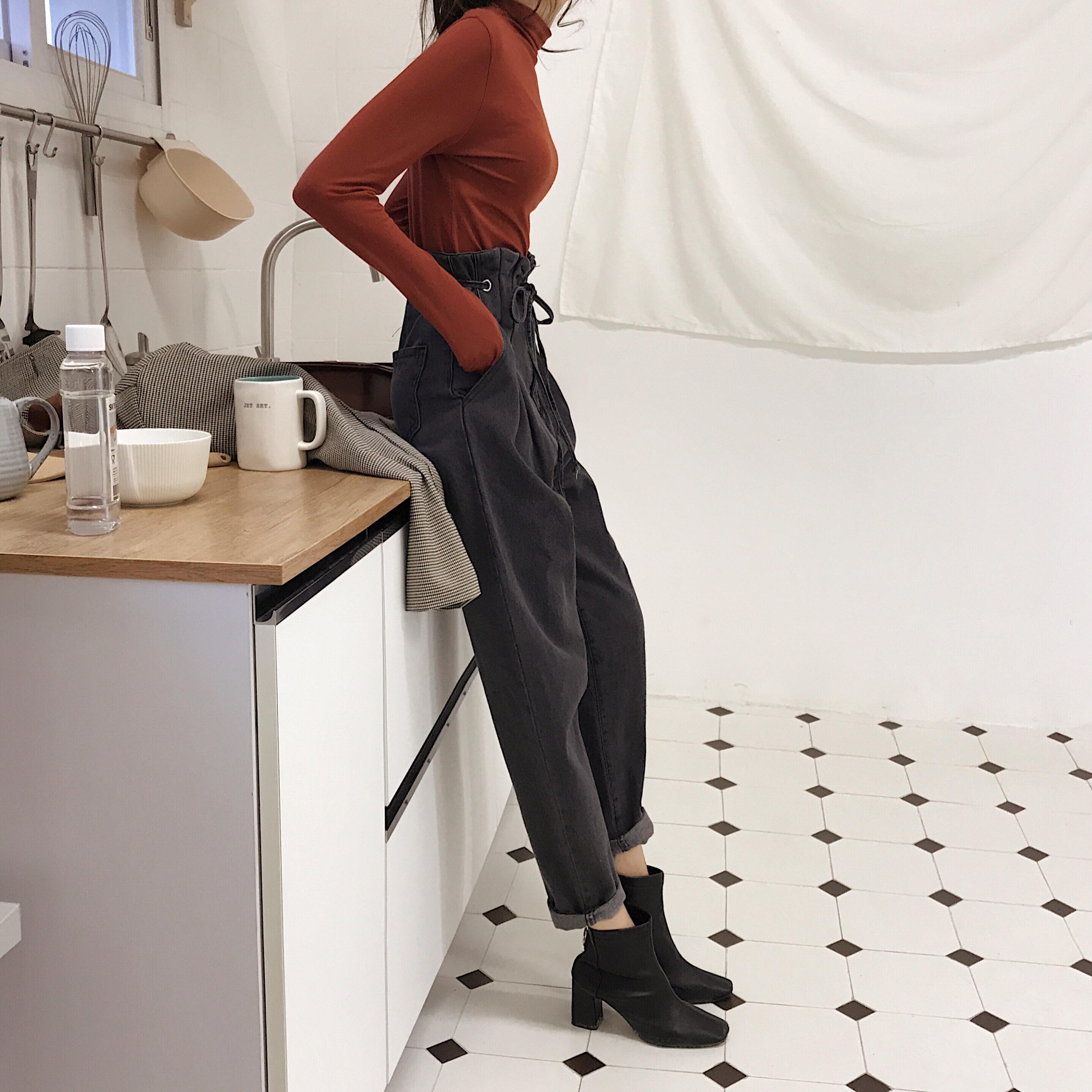 / 牛仔褲女秋冬新款chic港味復古寬松顯瘦高腰系繩牛百搭哈倫褲長褲