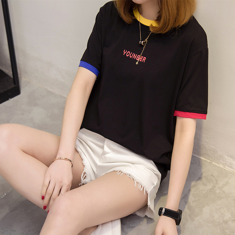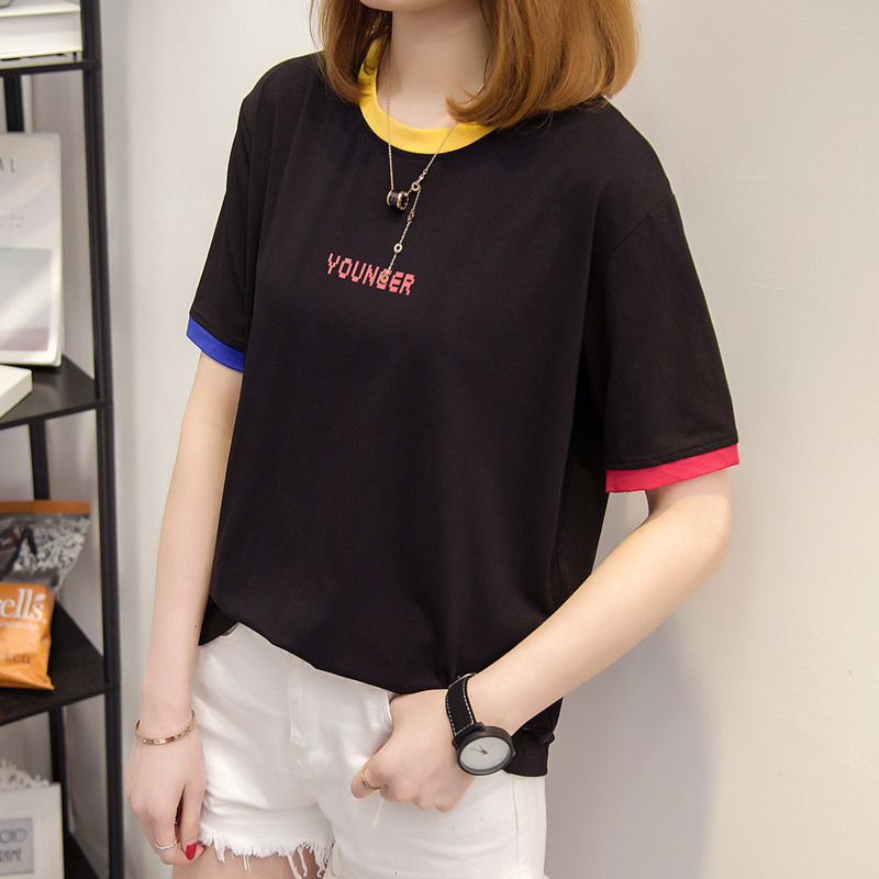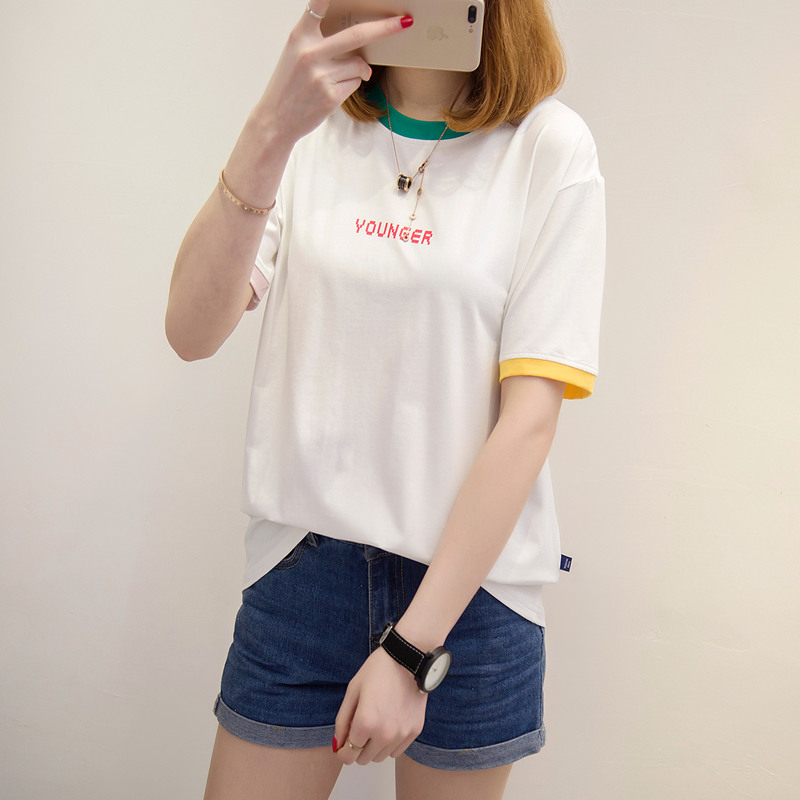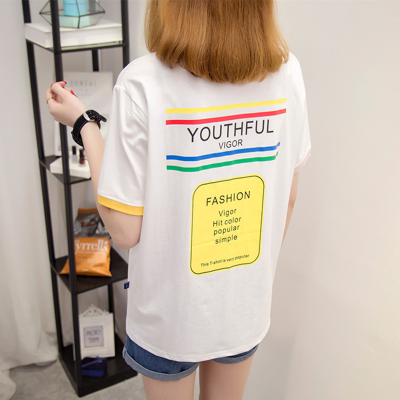 / 女裝夏裝新款潮寬松白色t恤女上衣短袖體恤衫字母拼色百搭潮