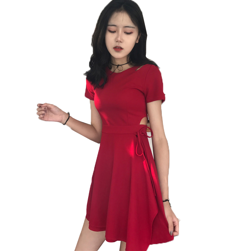 韓國chic風復古小心機性感鏤空顯瘦系帶小黑裙夏季修身短袖連衣裙