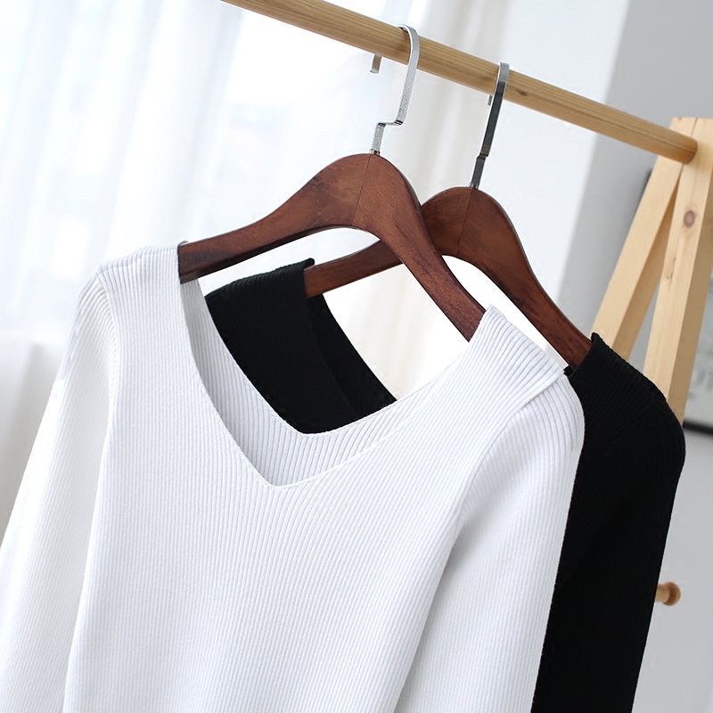 / 白色V領短款針織衫女修身長袖毛衣女春季新款針織打底衫毛衣
