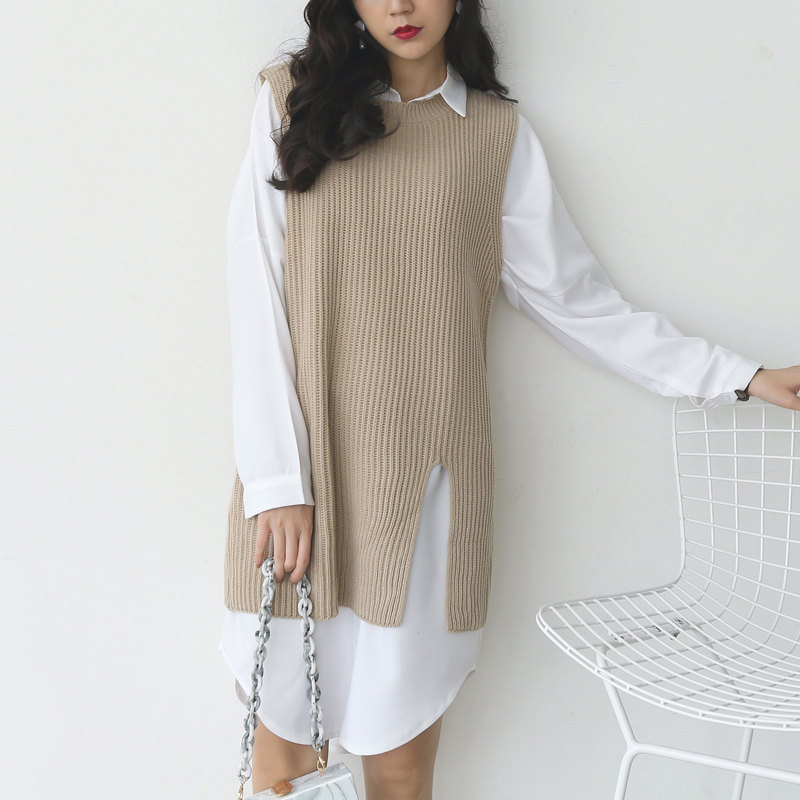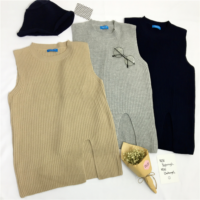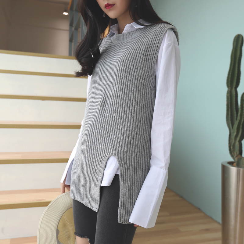 / 秋裝新款韓版寬松中長款針織衫開叉套頭無袖背心毛衣馬甲女裝