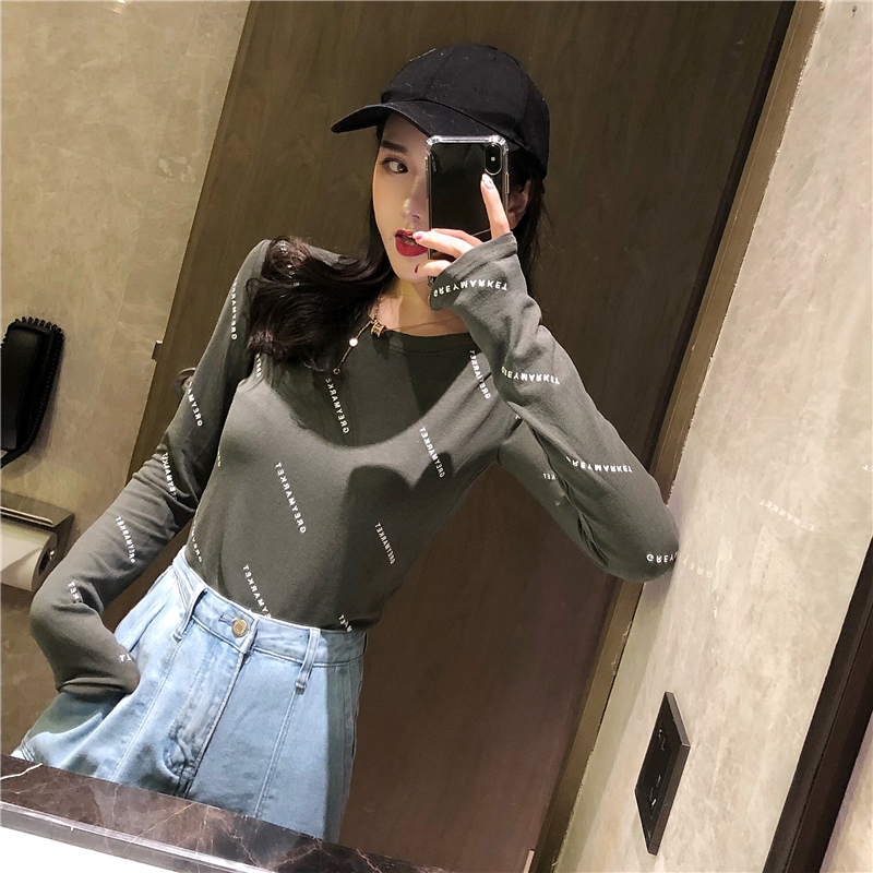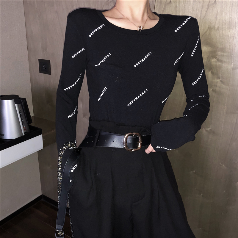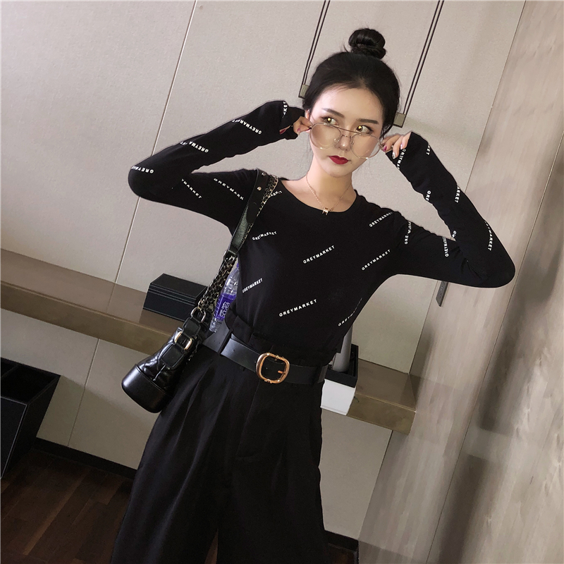 / chic早秋上衣女新款韓版T恤時尚字母印花高彈修身顯瘦長袖打底衫