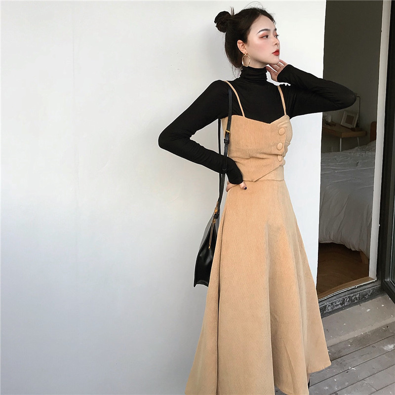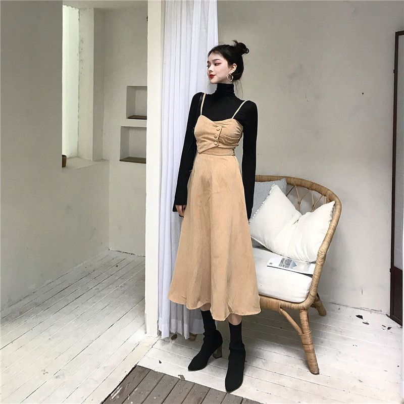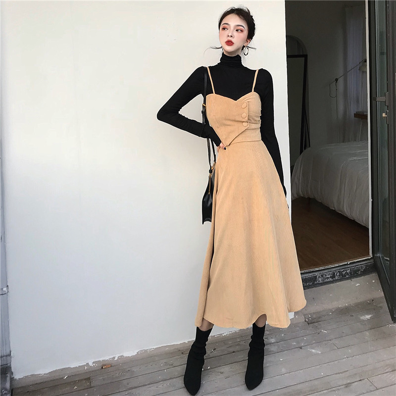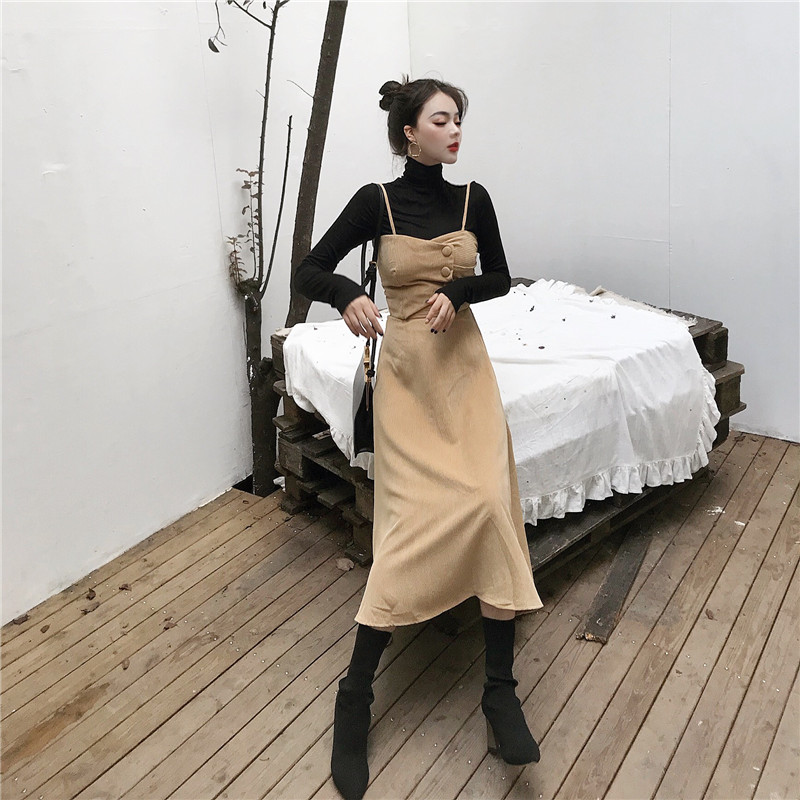 / 韓版修身復古中長款收腰燈芯絨吊帶連衣裙百搭高領打底衫時尚套裝