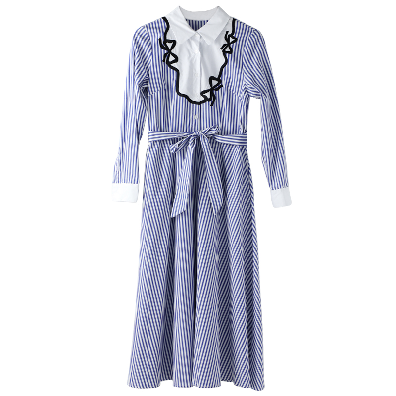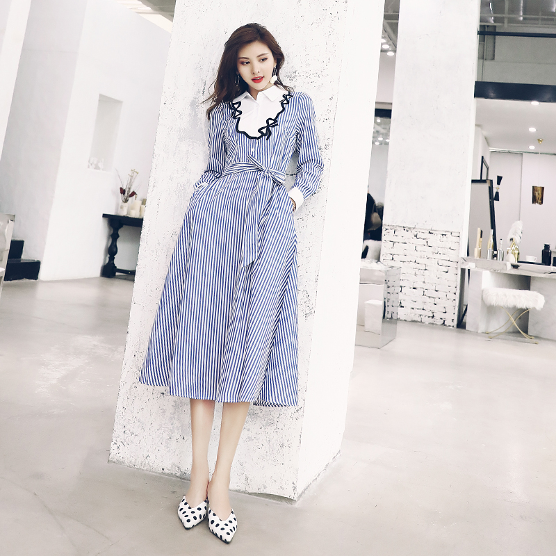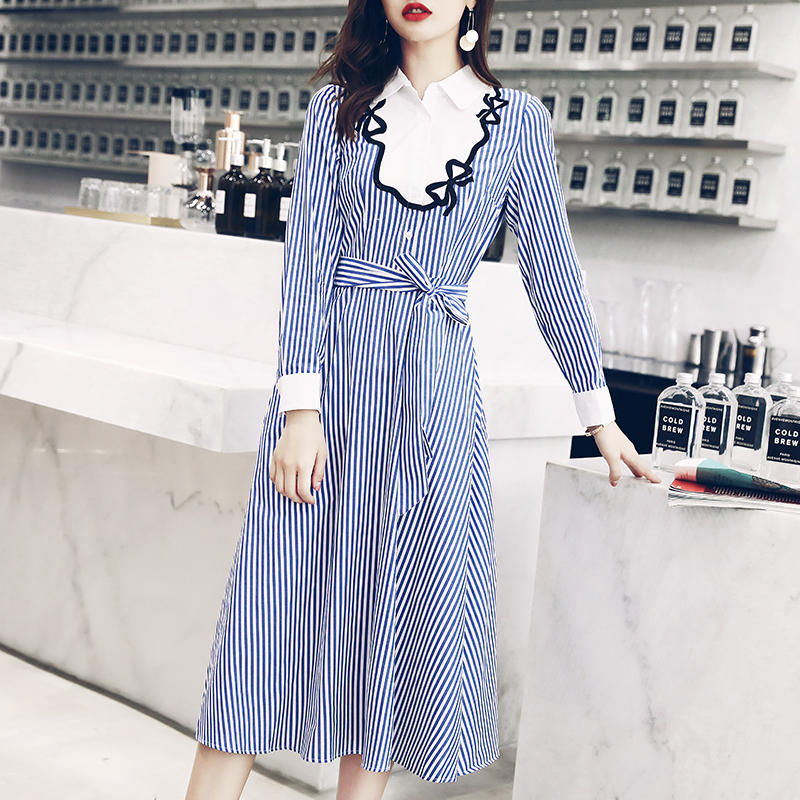 淑女名媛條紋連衣裙女夏裝2018新款中長款慵懶風氣質長袖襯衫裙子