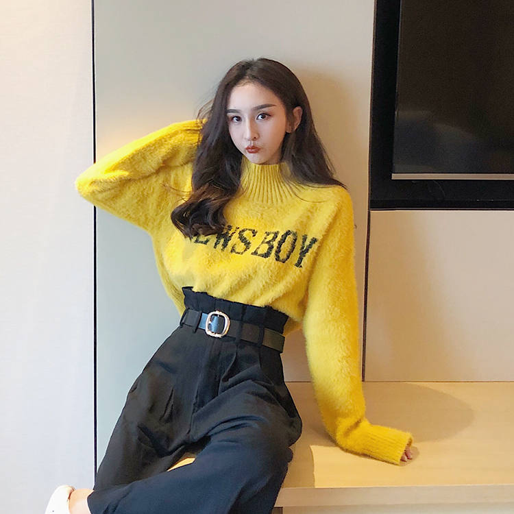 / 復古毛茸茸高領寬松純色字母毛衣高腰漆皮半身短裙時尚套裝兩件套