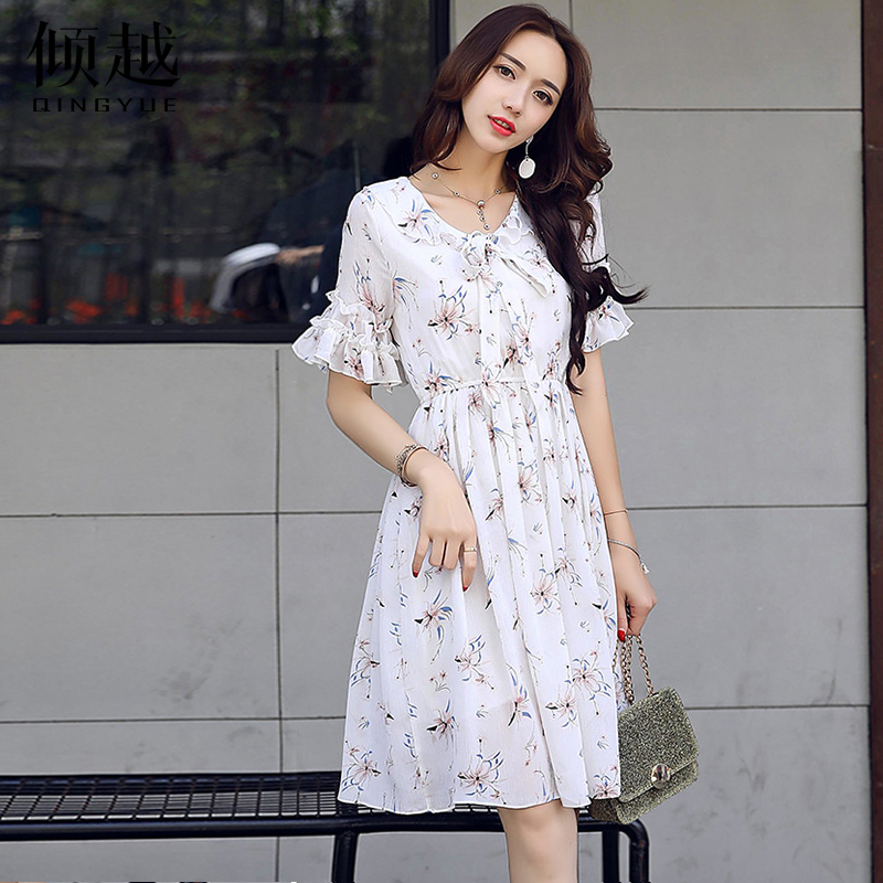 雪紡連衣裙女夏2017夏季新款女裝韓版小清新裙子收腰荷葉袖碎花裙