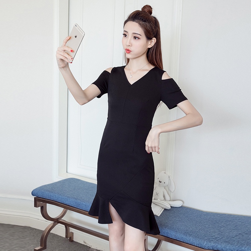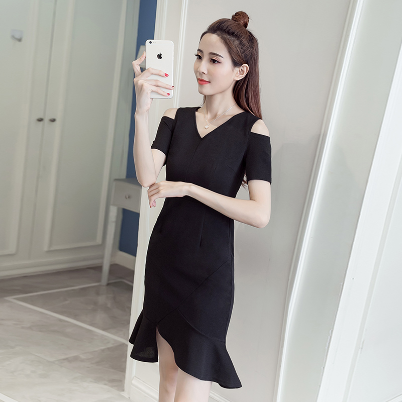 / 裙子夏季新款女潮 露肩連衣裙性感v領黑色短袖不規則魚尾裙