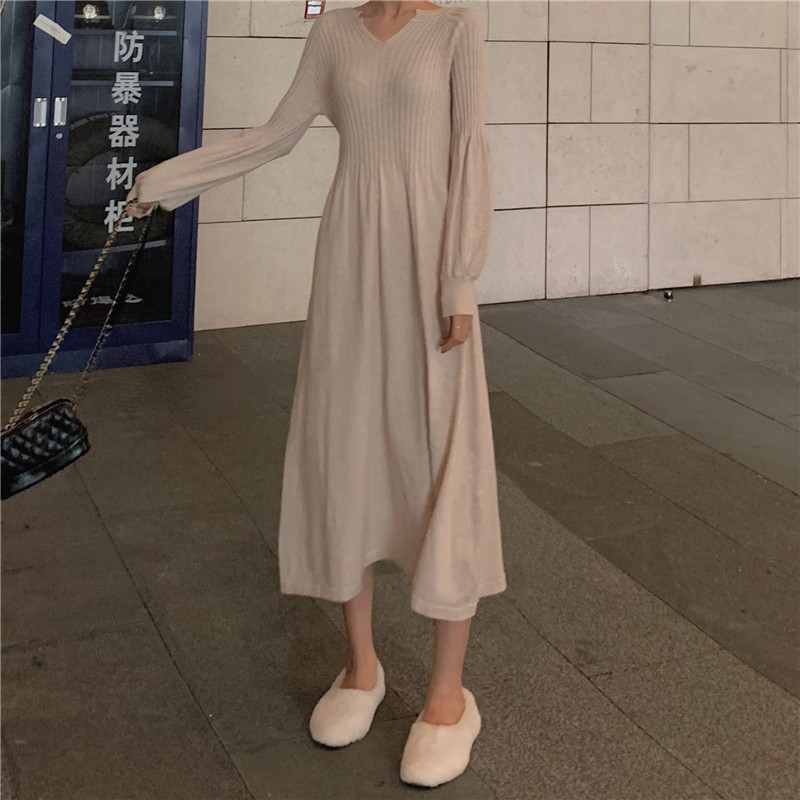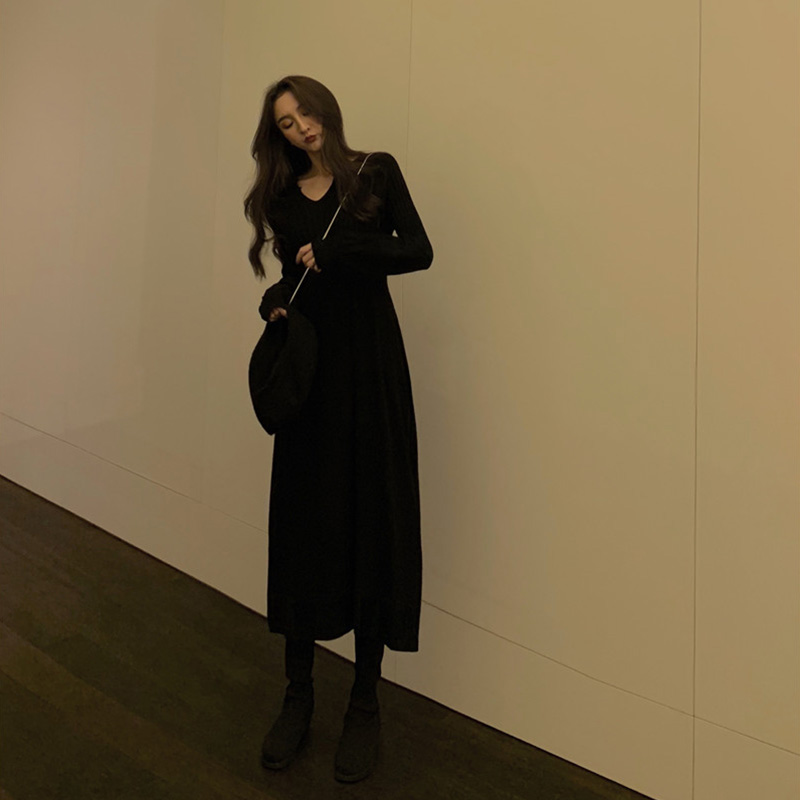 裙子女秋冬新款韓版簡約百搭長袖V領套頭針織連衣裙修身打底裙潮