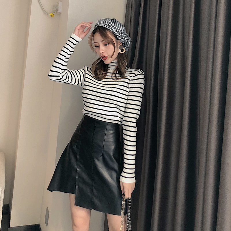 上衣女2018秋冬新款韓版修身顯瘦高領條紋長袖chic百搭針織打底衫