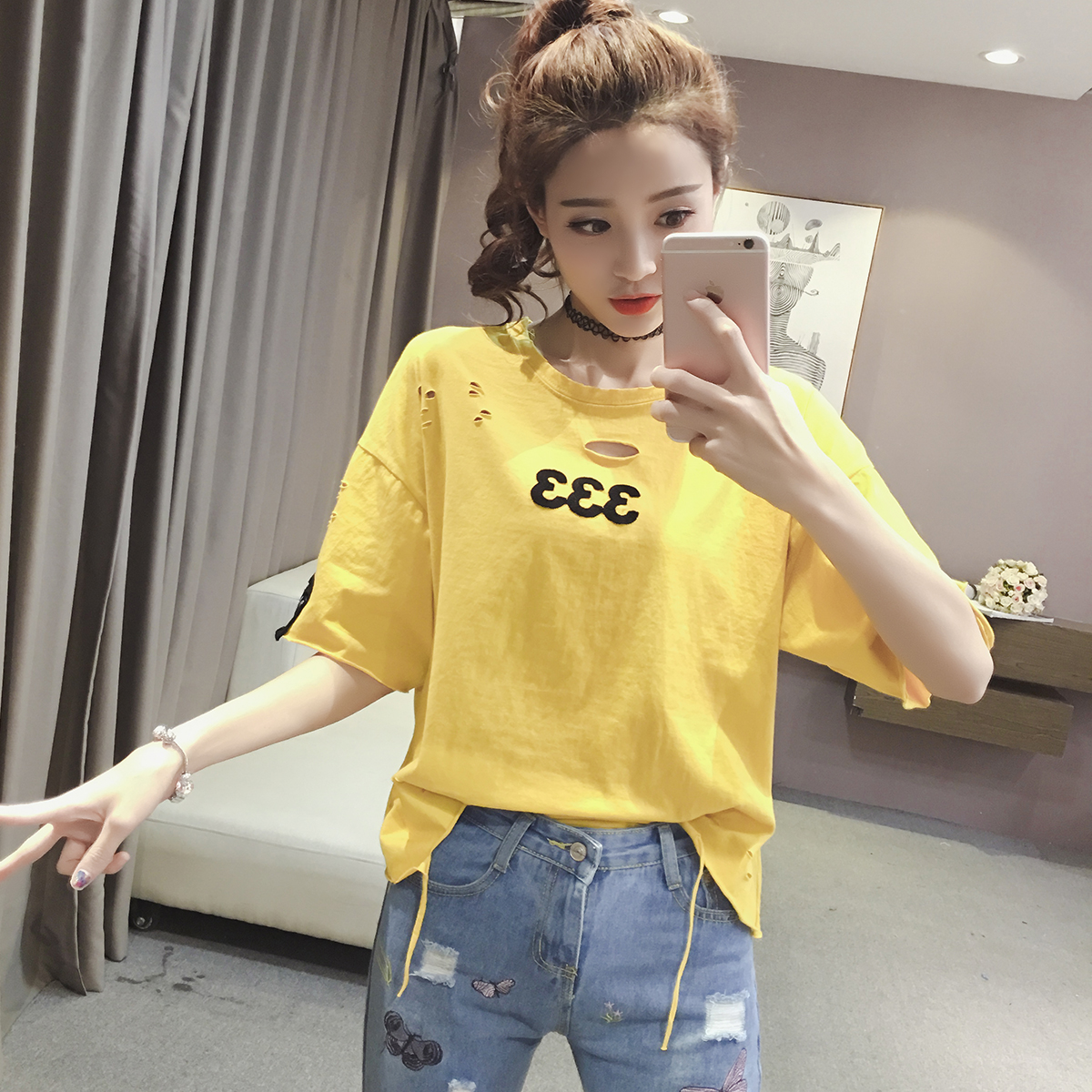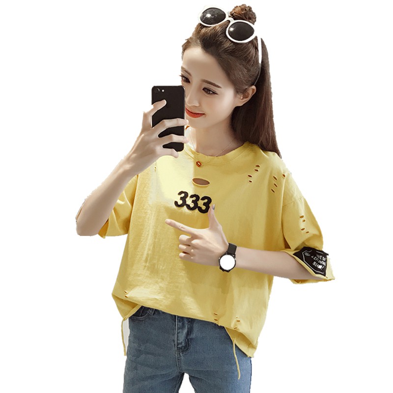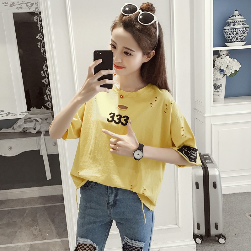 / 短袖t恤女夏季新款韓版學生寬松破洞T恤百搭數字貼布上衣小衫