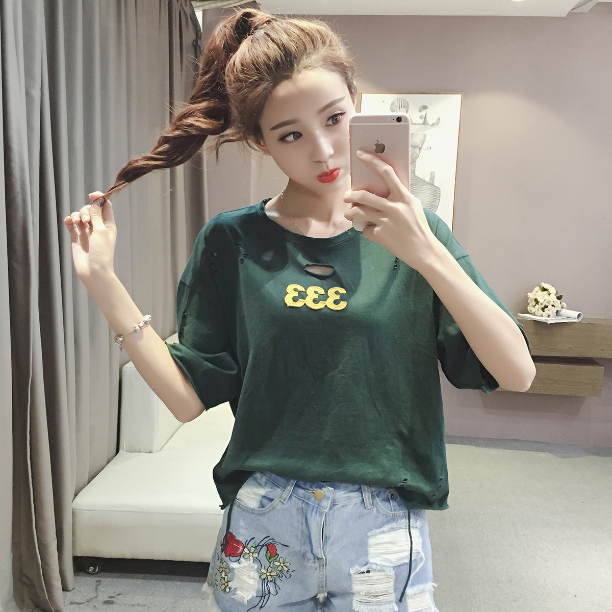 短袖t恤女夏季新款韓版學生寬松破洞T恤百搭數字貼布上衣小衫