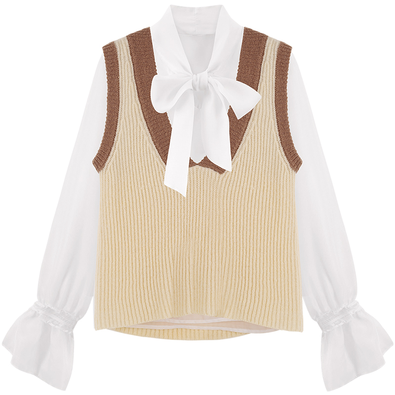 MG小象雪紡白襯衫女外搭V領針織背心蝴蝶結小清新復古chic上衣潮