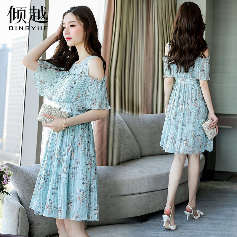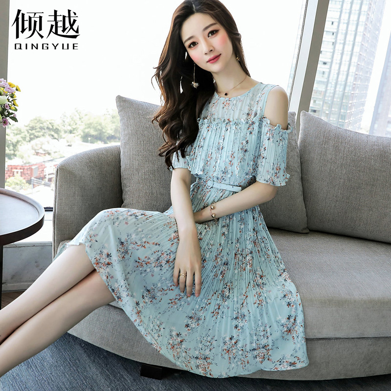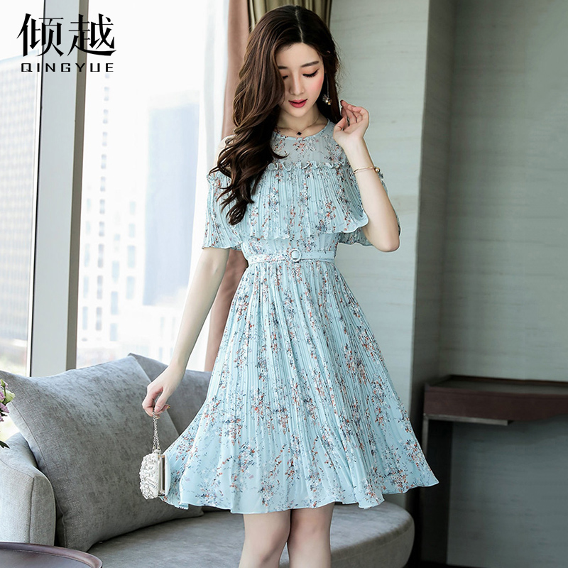 裙子女夏2017新款小清新露肩荷葉邊淑女腰帶褶皺雪紡連衣裙百褶裙