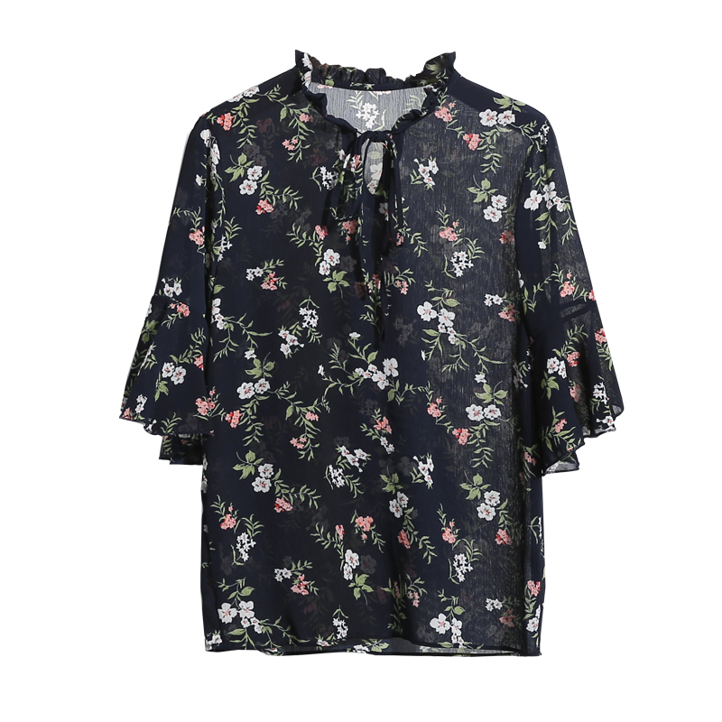 春夏寬松顯瘦七分袖百搭女裝上衣喇叭袖碎花雪紡上衣印花雪紡衫女