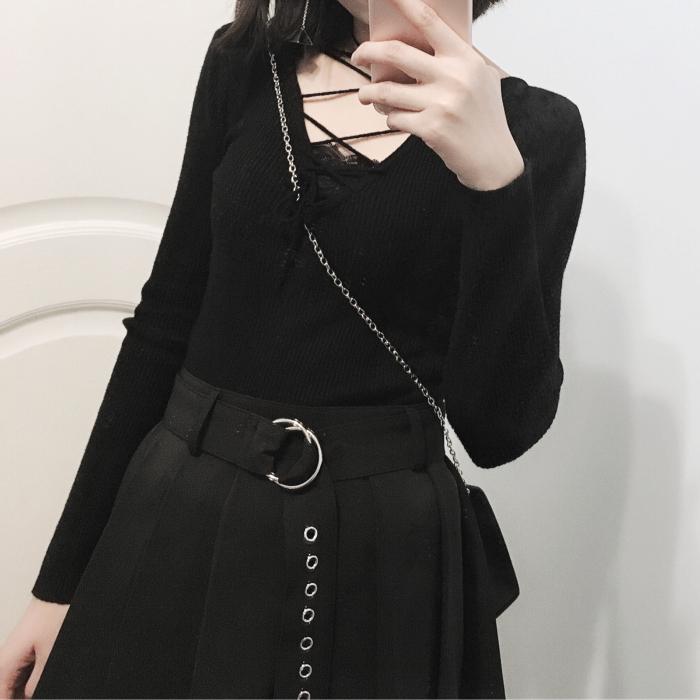 復古港風chic前后兩穿交叉綁帶v領顯瘦性感打底針織衫修身上衣女