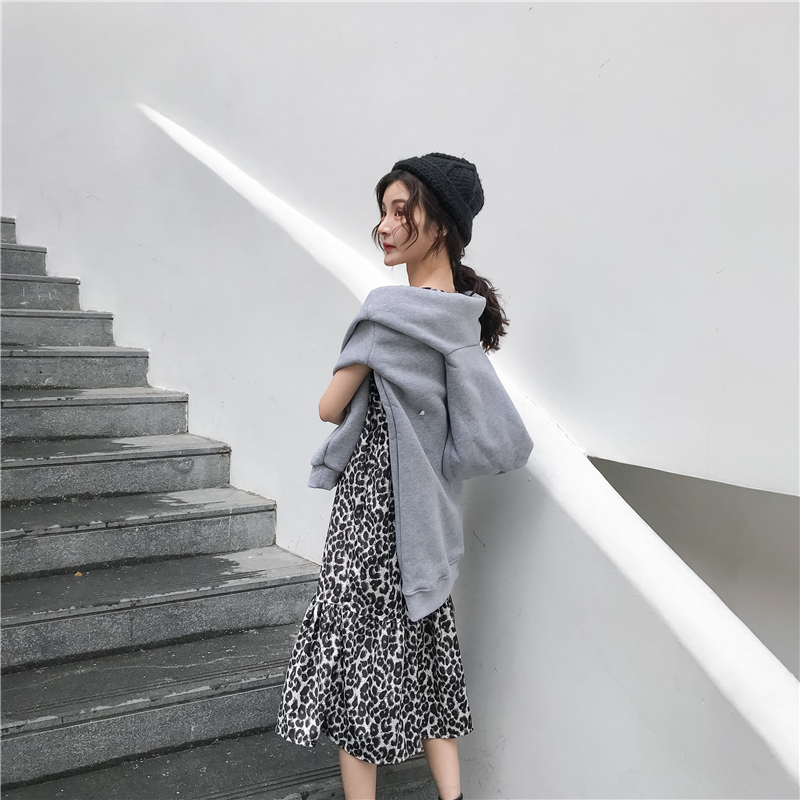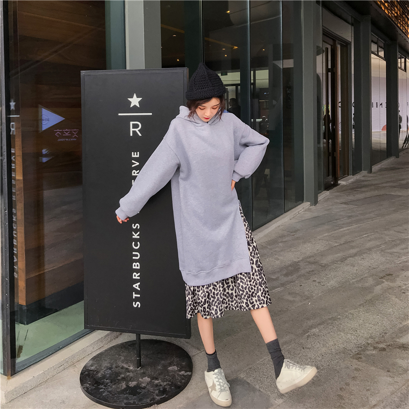 港味復古寬松中長款加絨連帽長袖衛衣+韓版豹紋百搭裙子