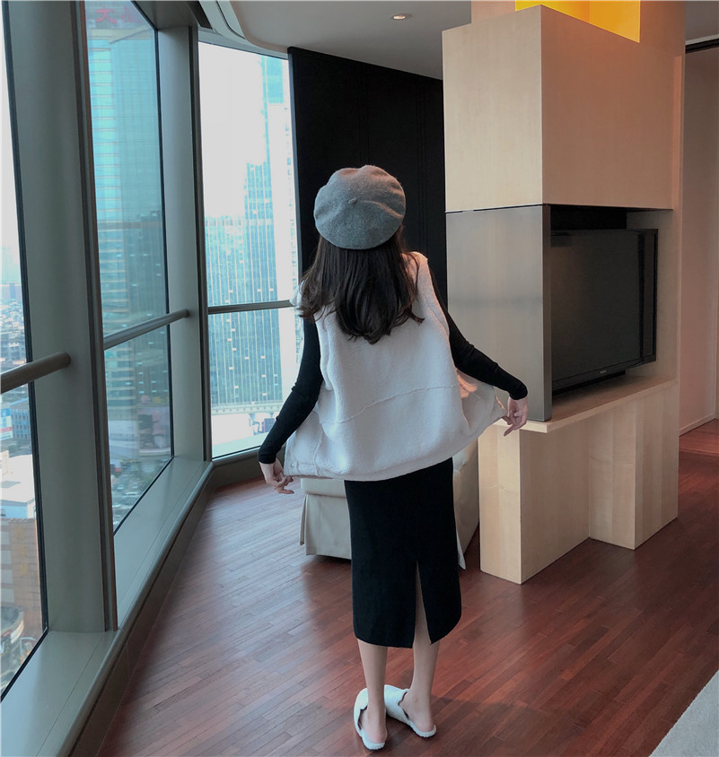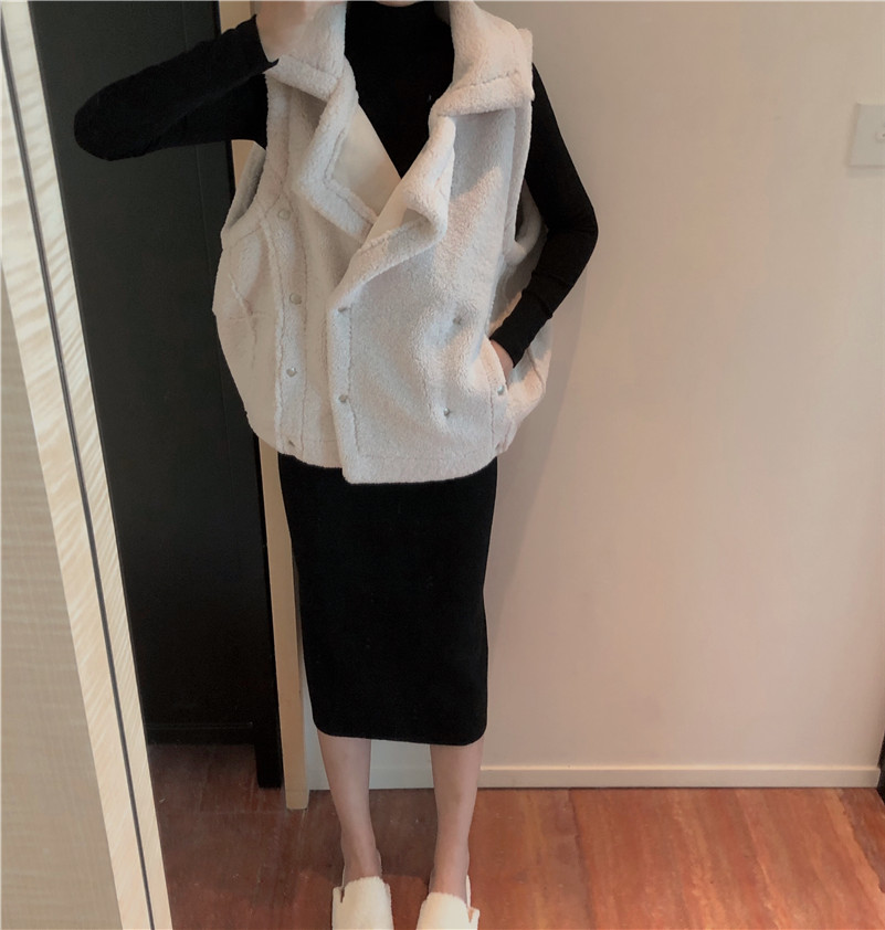 羊羔毛馬夾|黑色打底衫|黑色半身裙