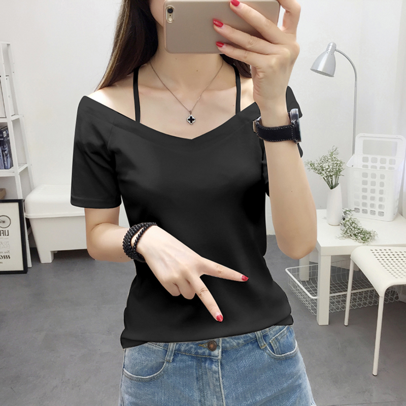 / 夏裝韓版漏肩純色v領t恤女短袖打底衫心機半袖體恤短款上衣潮