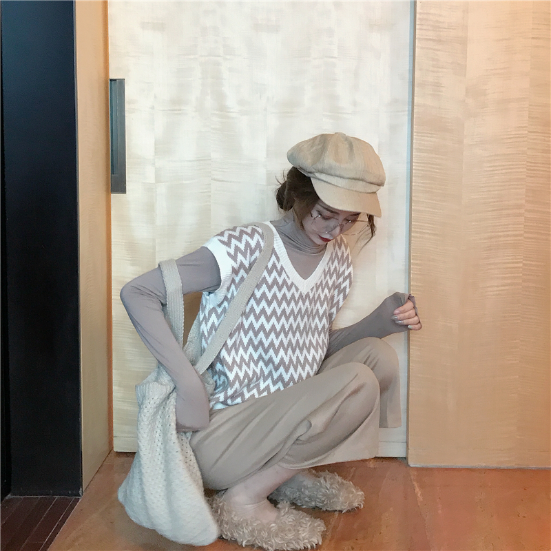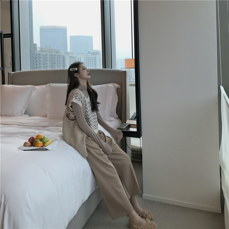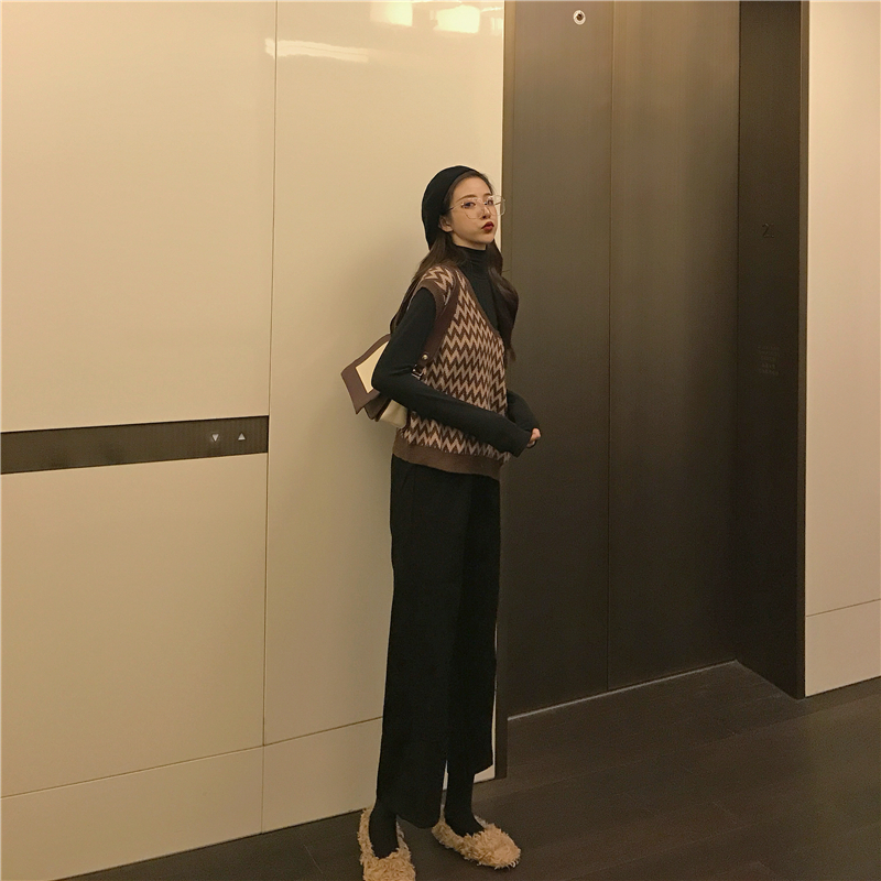 / 新款韓版兩件套復古菱格撞色V領毛衣馬甲百搭純色闊腿褲時尚套裝