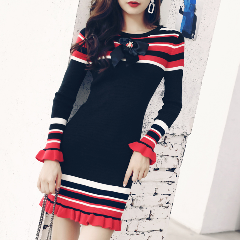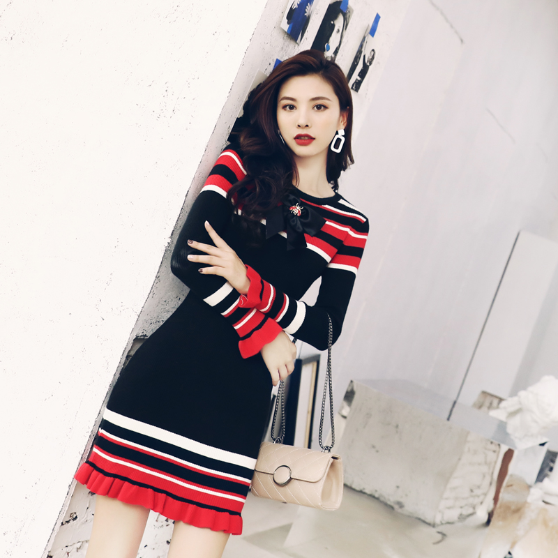 早秋新款女裝2018緊身針織秋冬打底連衣裙修身中長款長袖秋季裙子