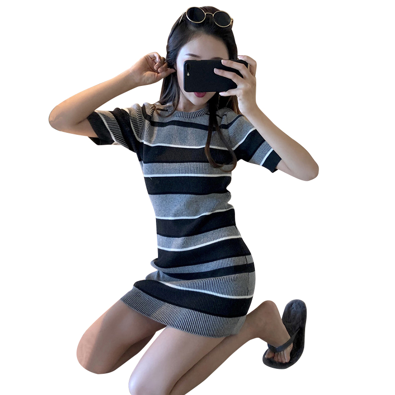 / 港味復古chic風新款優雅氣質撞色短袖條紋針織連衣裙修身顯瘦短裙