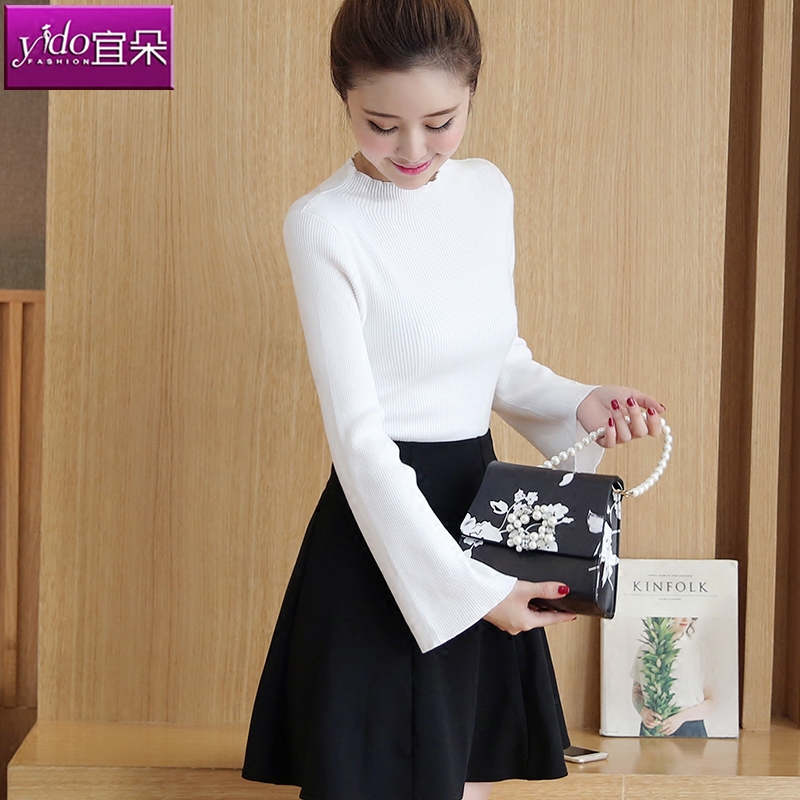 / 春季新款圓領純色毛衣女套頭修身喇叭袖針織打底衫長袖針織衫