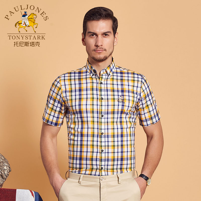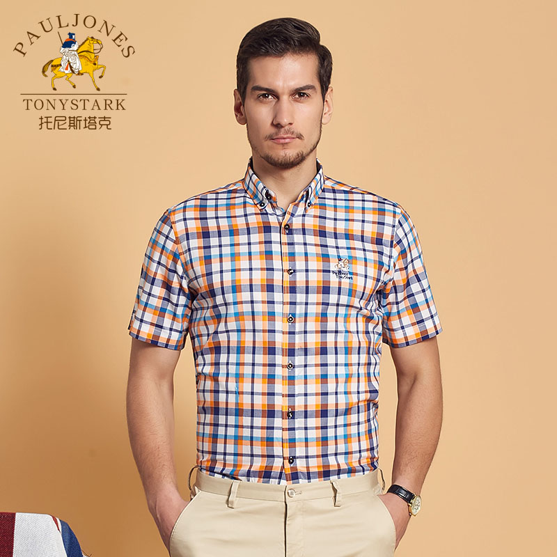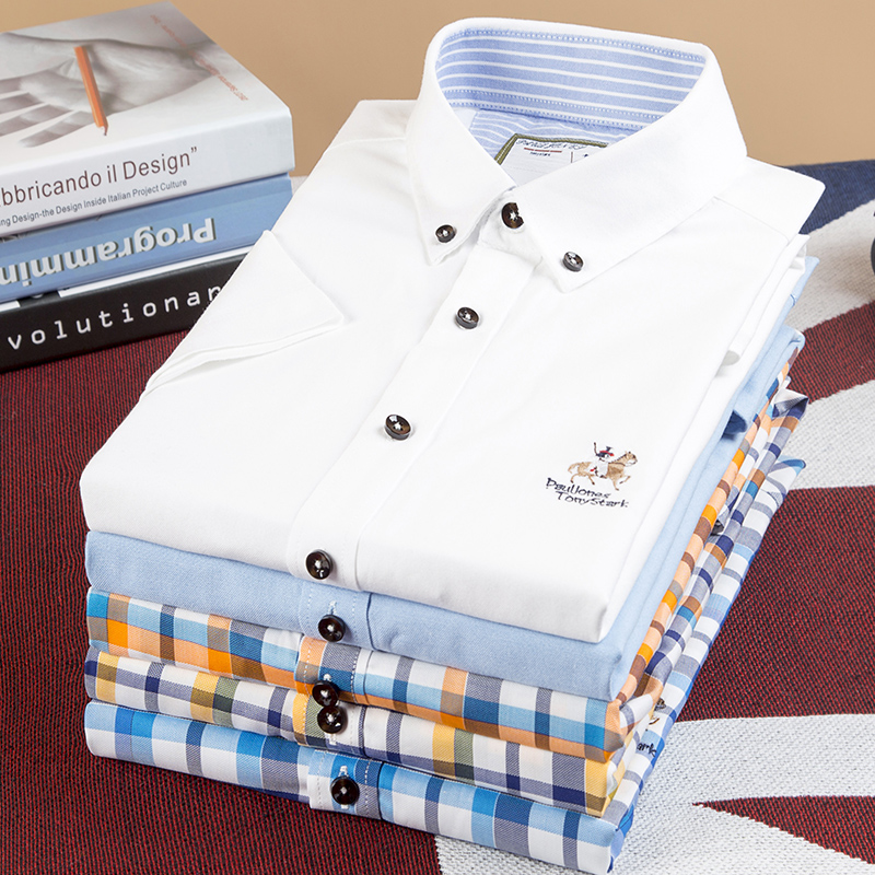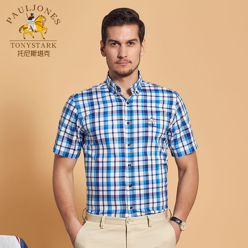 / 夏季薄款男士藍白格子短袖襯衫扣領商務休閑免燙中年保羅半袖襯衣