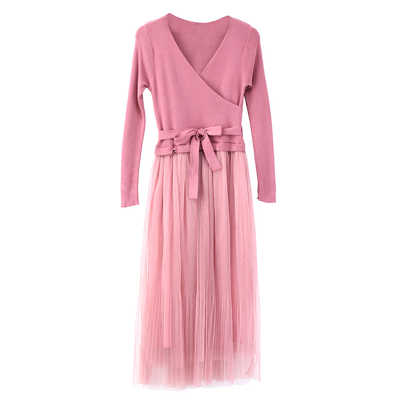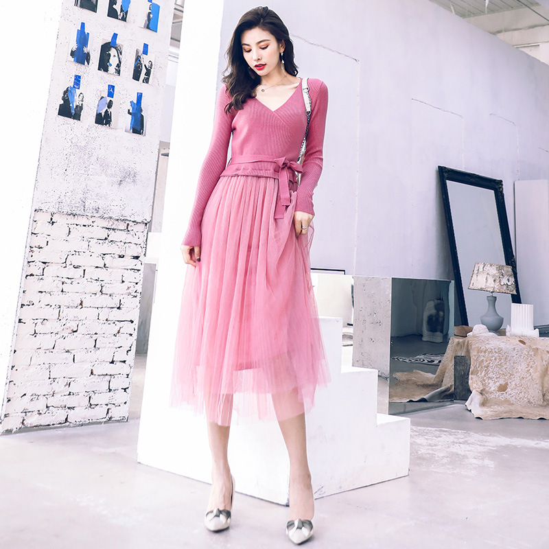名媛氣質秋裝女2018新款針織衫網紗拼接連衣裙兩件套洋氣打底裙子
