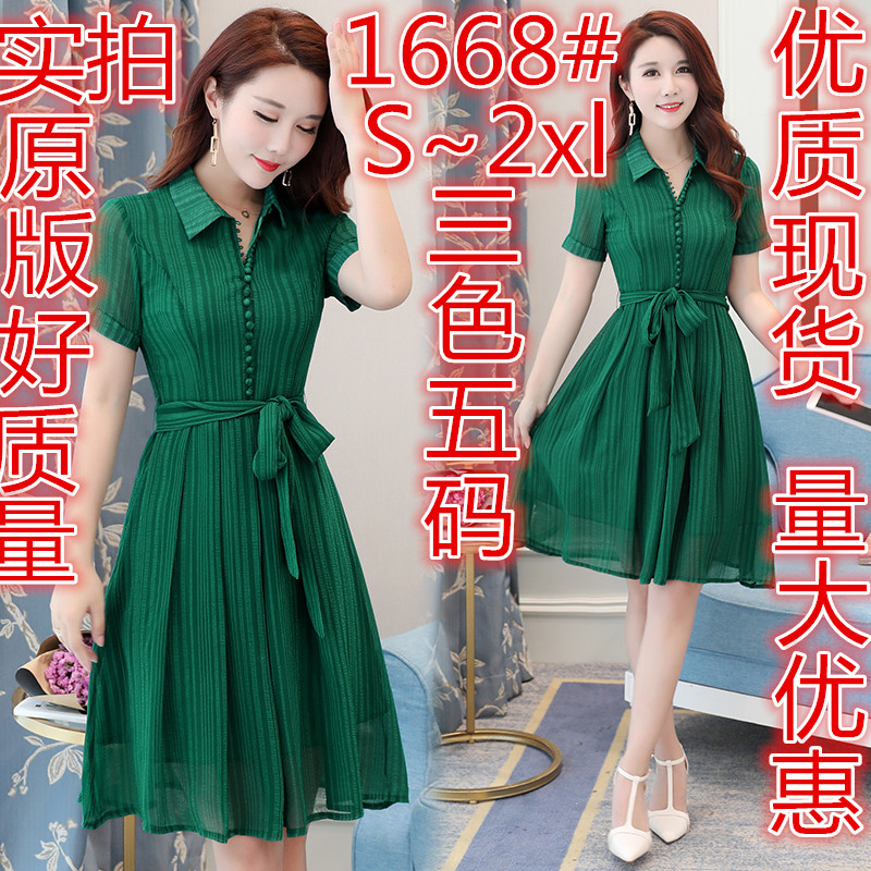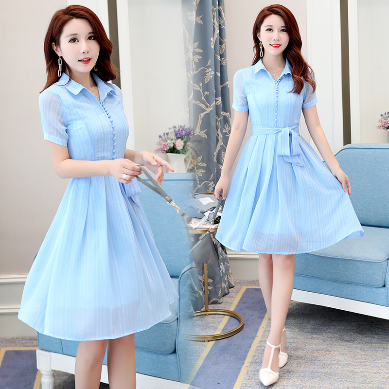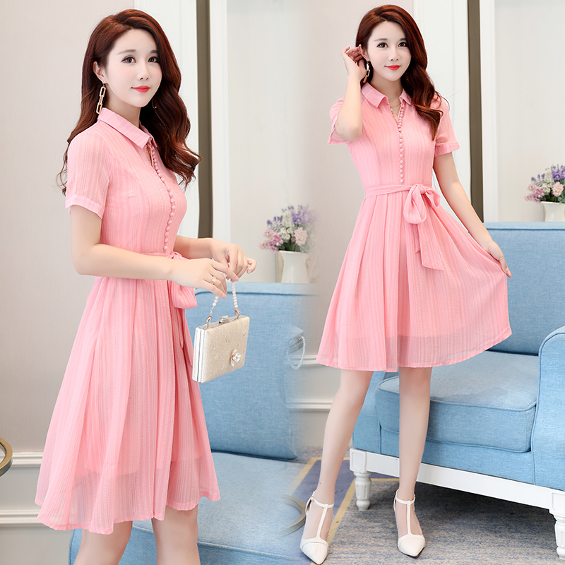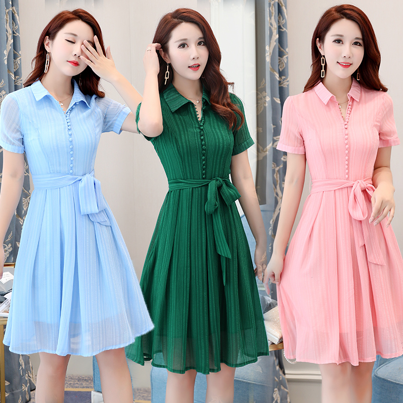雪紡連衣裙夏季小清新新款修身顯瘦淑女裝短袖中長款襯衫裙子