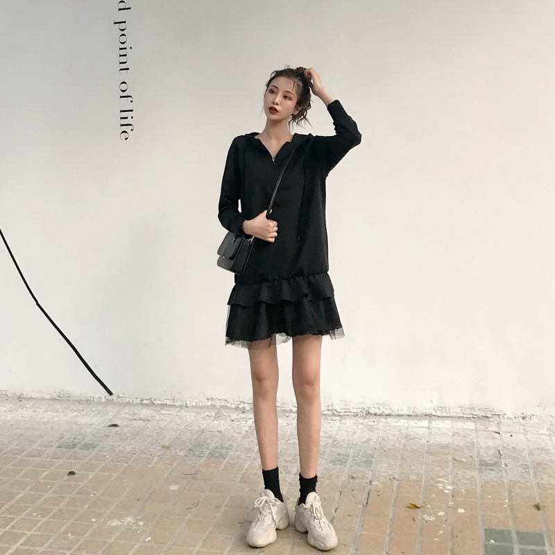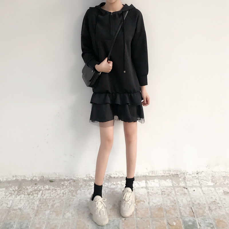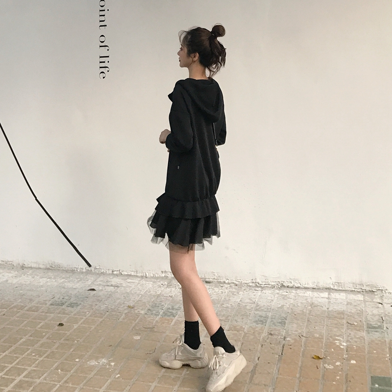 / 秋冬新款韓版衛衣連衣裙拼接假兩件紗裙少女裙長袖荷葉邊魚尾裙潮