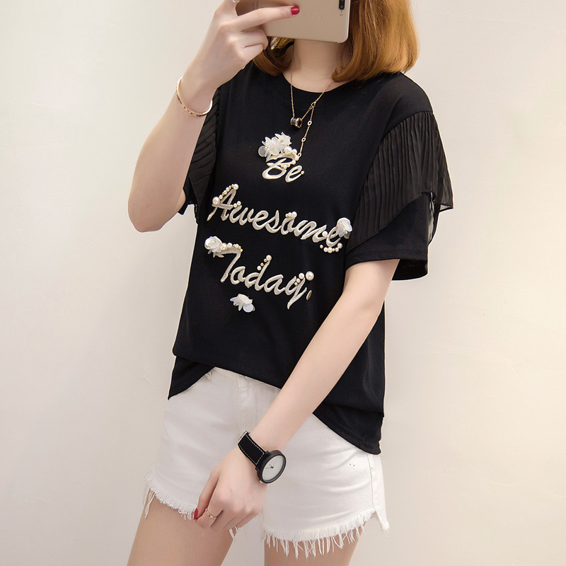 夏裝新款女裝上衣刺繡字母白色t恤女短袖寬松韓版休閑百搭潮