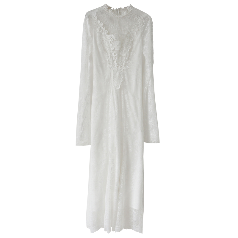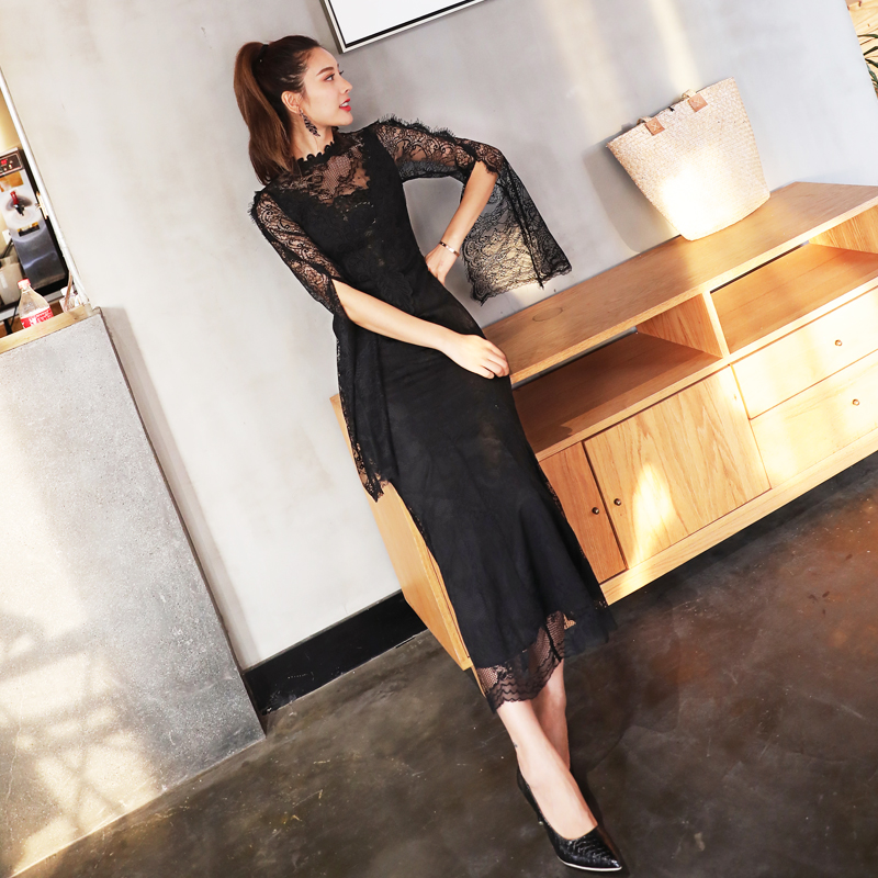 / 淑女氣質2018秋季新款百搭修身顯瘦蕾絲連衣裙圓領時尚長款連衣裙