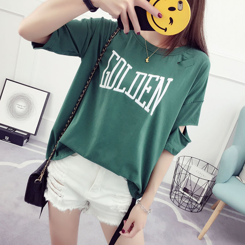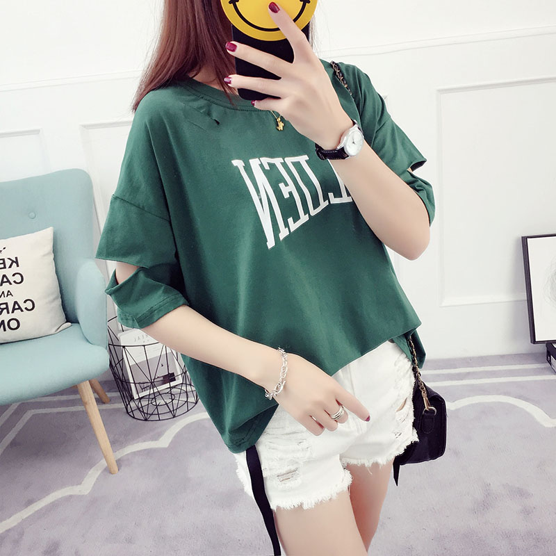 夏裝新款韓版學生寬松百搭短袖破洞衣服女t恤半袖潮女士體恤