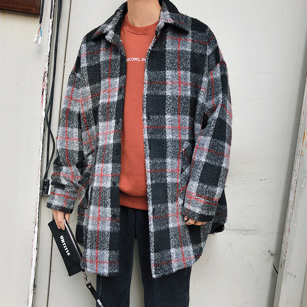 新款中長款男士毛呢大衣秋季韓版潮外套男格子大衣男潮流百搭外衣