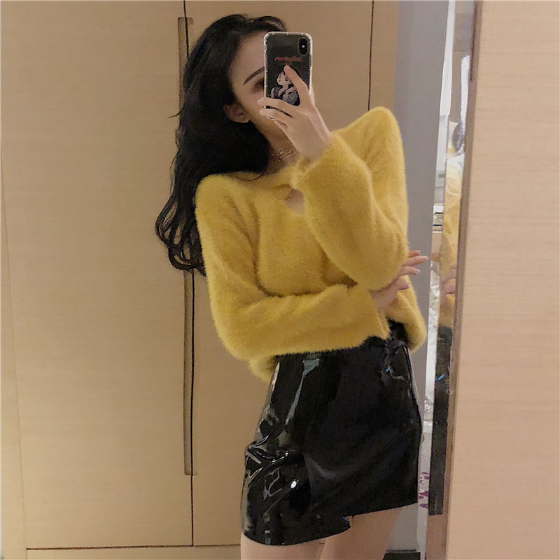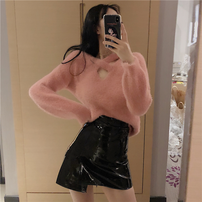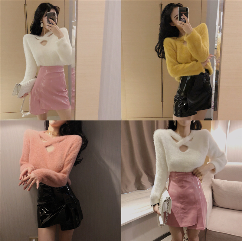 / 百搭韓版慵懶掛脖鏤空上衣時尚套裝高腰不規則PU皮裙小性感兩件套