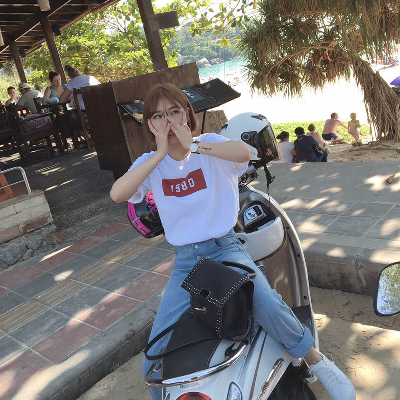春夏新款韓版寬松顯瘦白色簡約數字圓領短袖圓領上衣T恤女裝