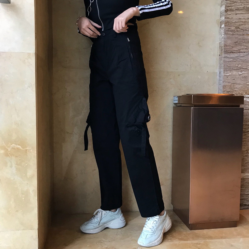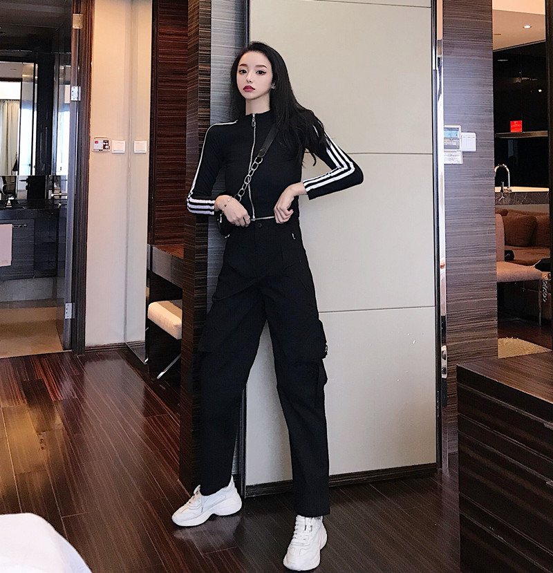 / 機車寬松直筒闊腿工裝褲時尚套裝長袖黑色顯瘦性感外套女兩件套潮