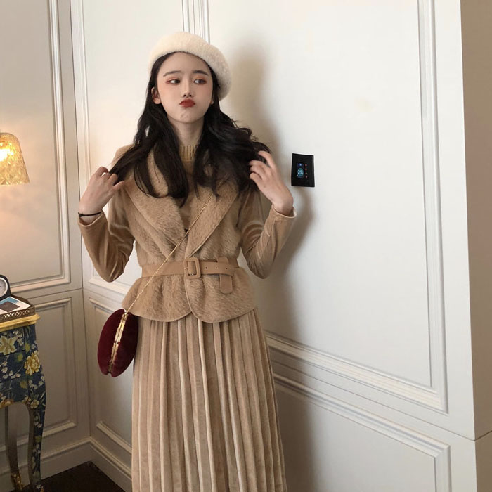 復古秋裝女2018新款套裝時尚壓褶收腰連衣裙女+百搭小馬甲兩件套