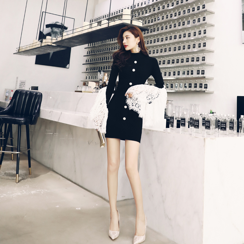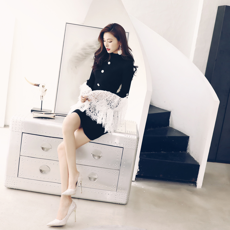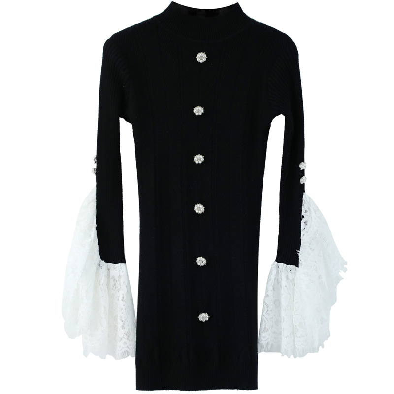 / 裙子打底衫女中長款韓版蕾絲拼接顯瘦長袖上衣半高領針織連衣裙潮