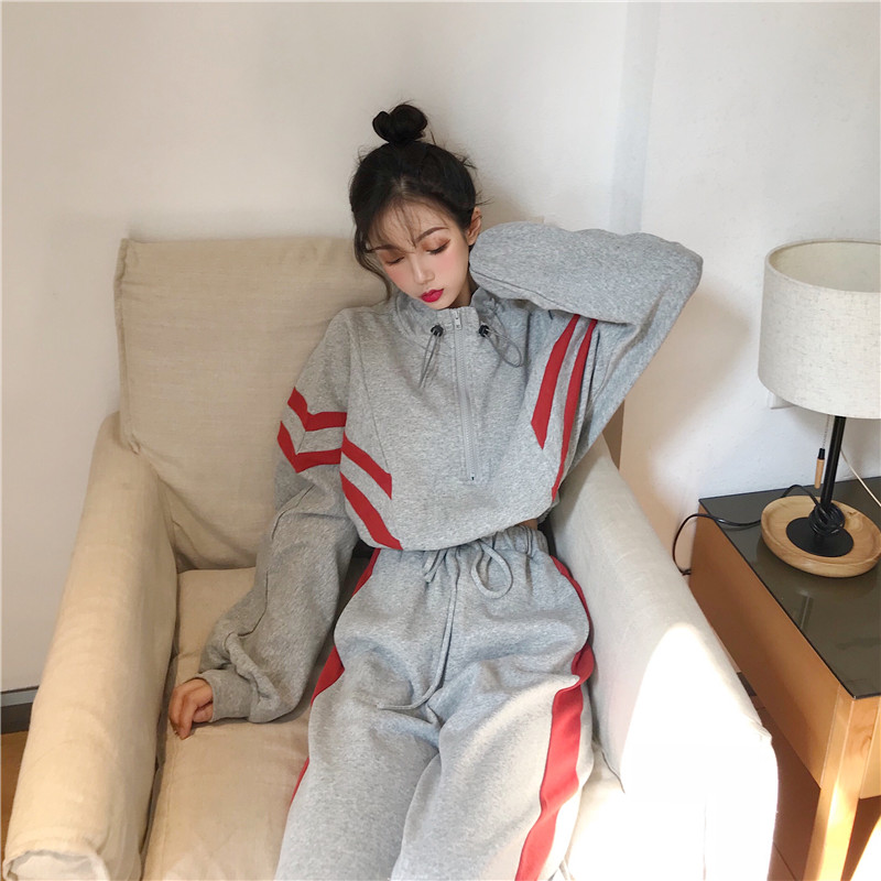 / 港味2018秋季新款時尚套裝長袖拼接上衣松緊腰休閑束腳褲兩件套女
