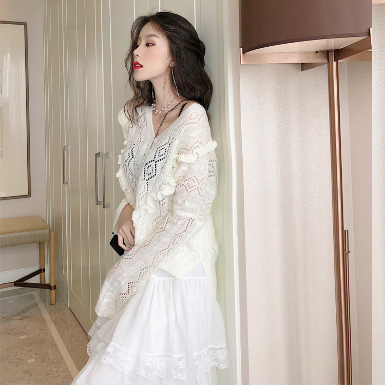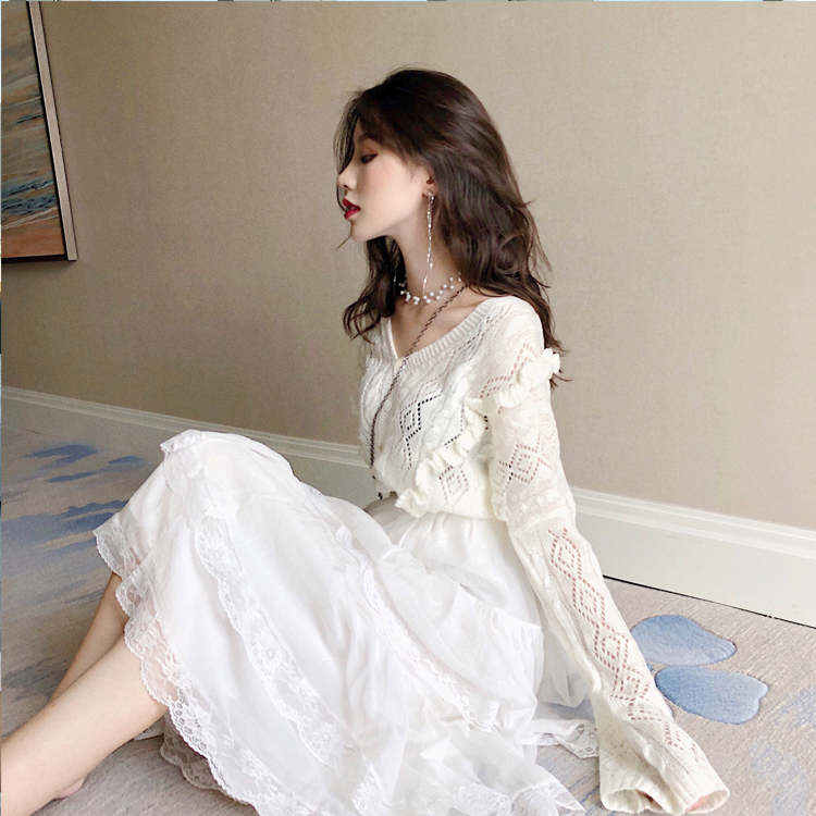 / 秋裝新款韓版木耳邊V領氣質毛衣超仙蕾絲蛋糕裙港風chic時尚套裝