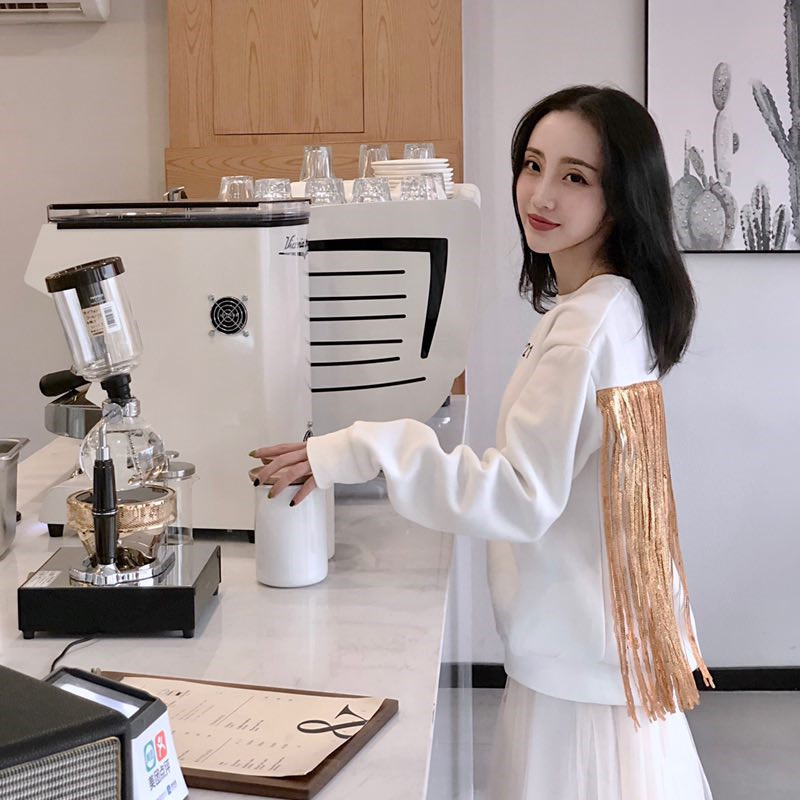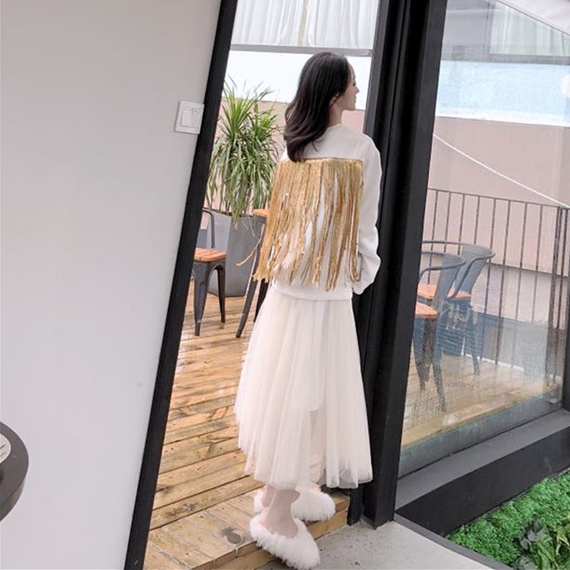2018秋裝新款韓版套裝后背亮片流蘇衛衣A字網紗裙兩件套時尚女裝