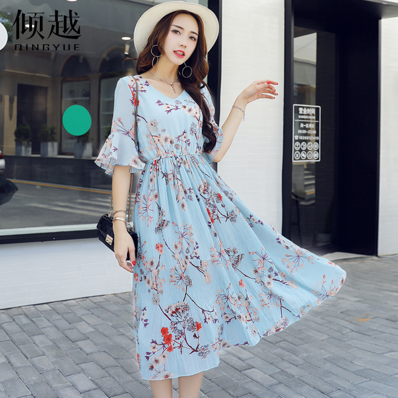 / 2017夏季新款女裝韓版氣質V領喇叭袖雪紡裙大擺碎花長裙連衣裙女