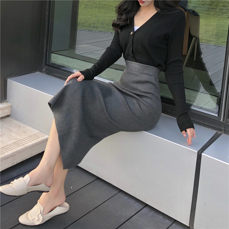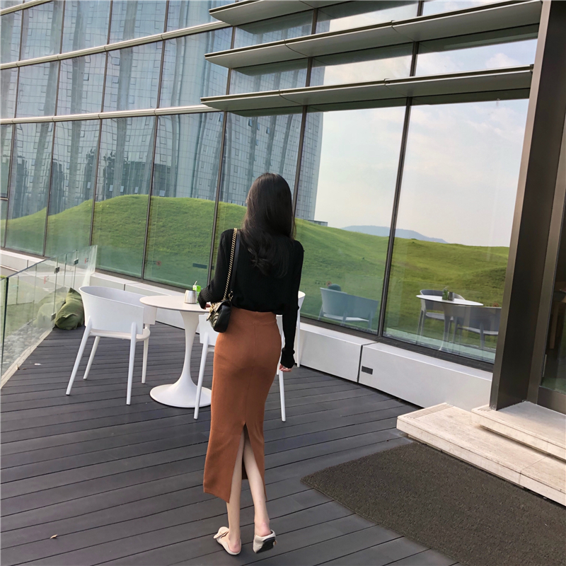 / 裙子女新款韓版chic秋天港味溫柔復古高腰開叉修身針織百搭半身裙
