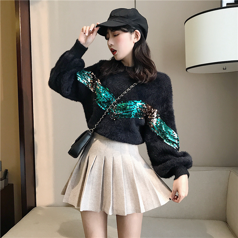 秋冬時尚套裝珠片繡寬松套頭加厚毛衣百褶毛呢半身裙短裙褲潮