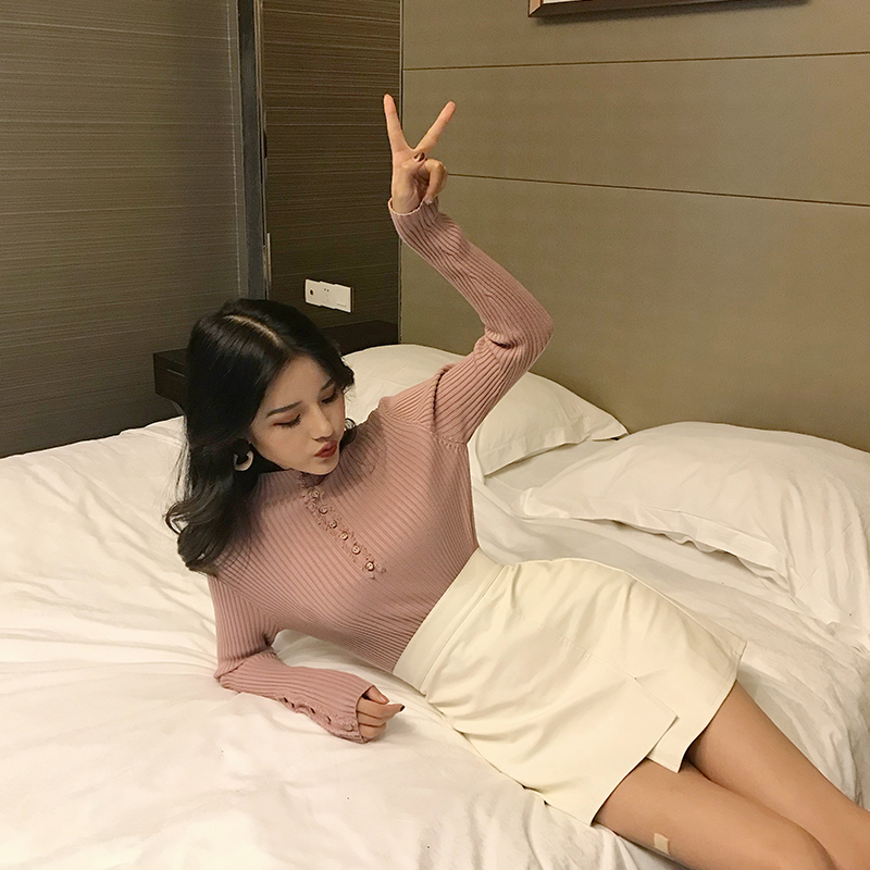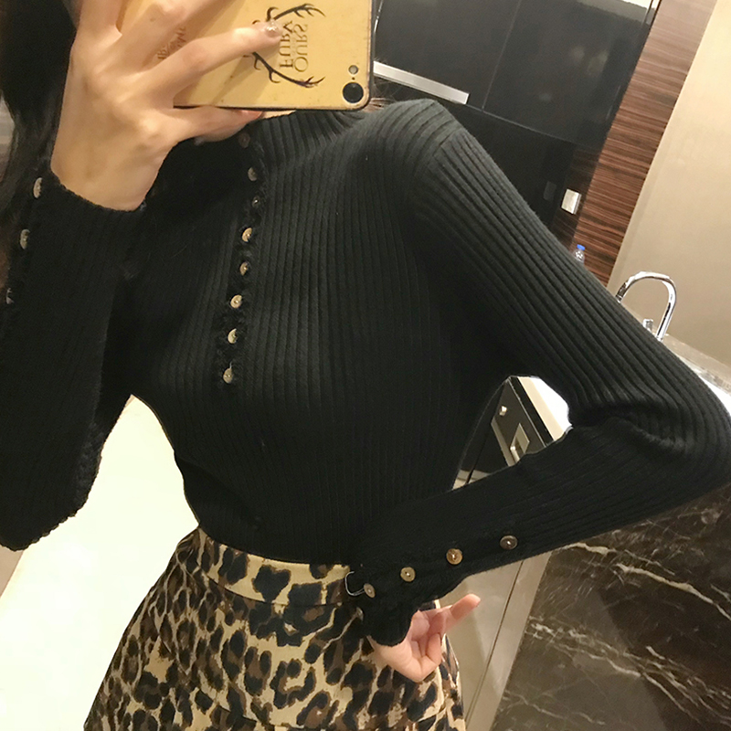 / 秋冬新款韓版加厚純色修身顯瘦坑條上衣女裝百搭長袖氣質針織衫潮