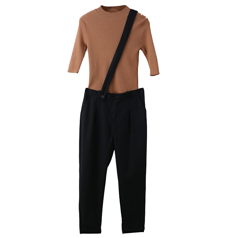 / 2018夏季新款修身顯瘦氣質針織衫毛衣七分小腳褲背帶褲秋季套裝潮